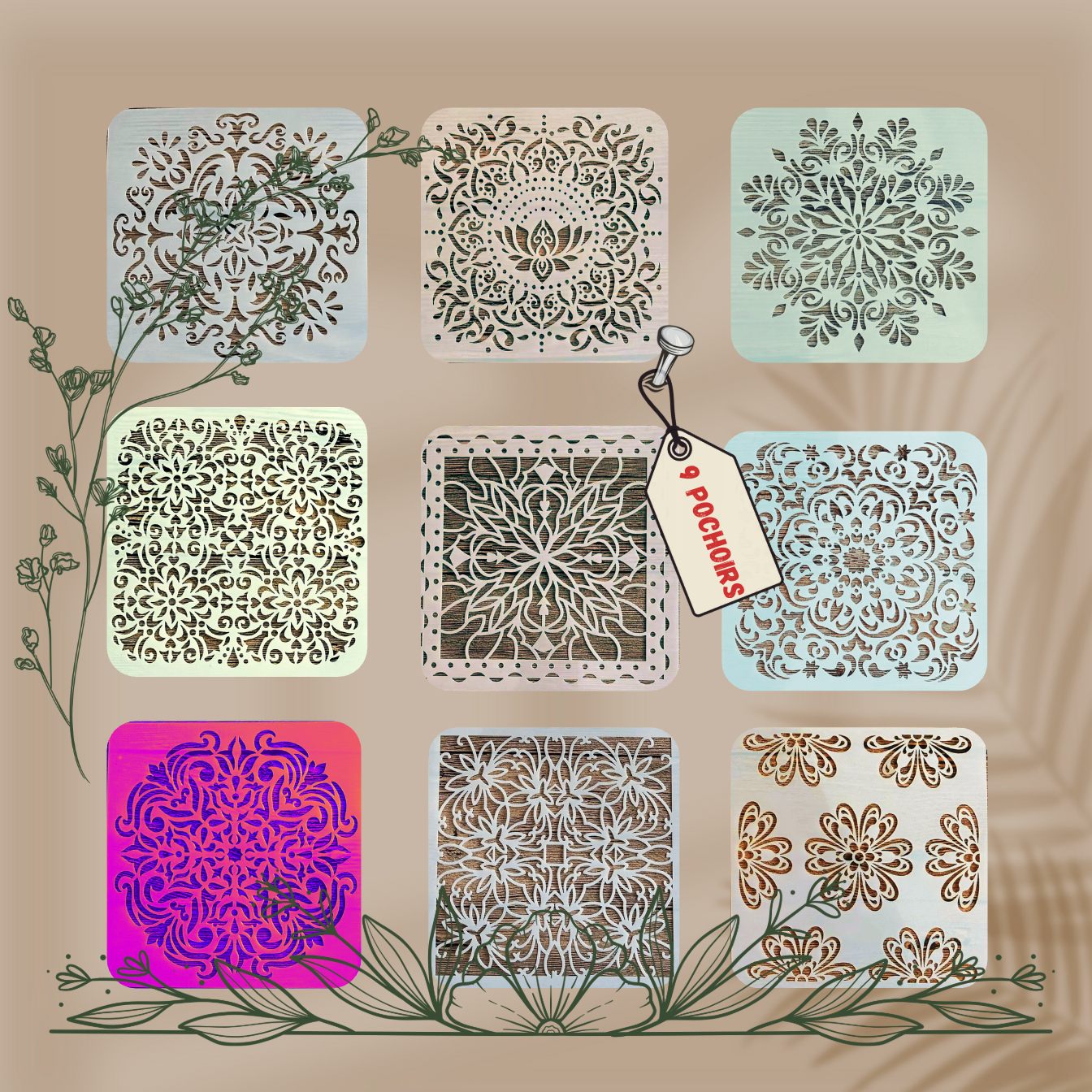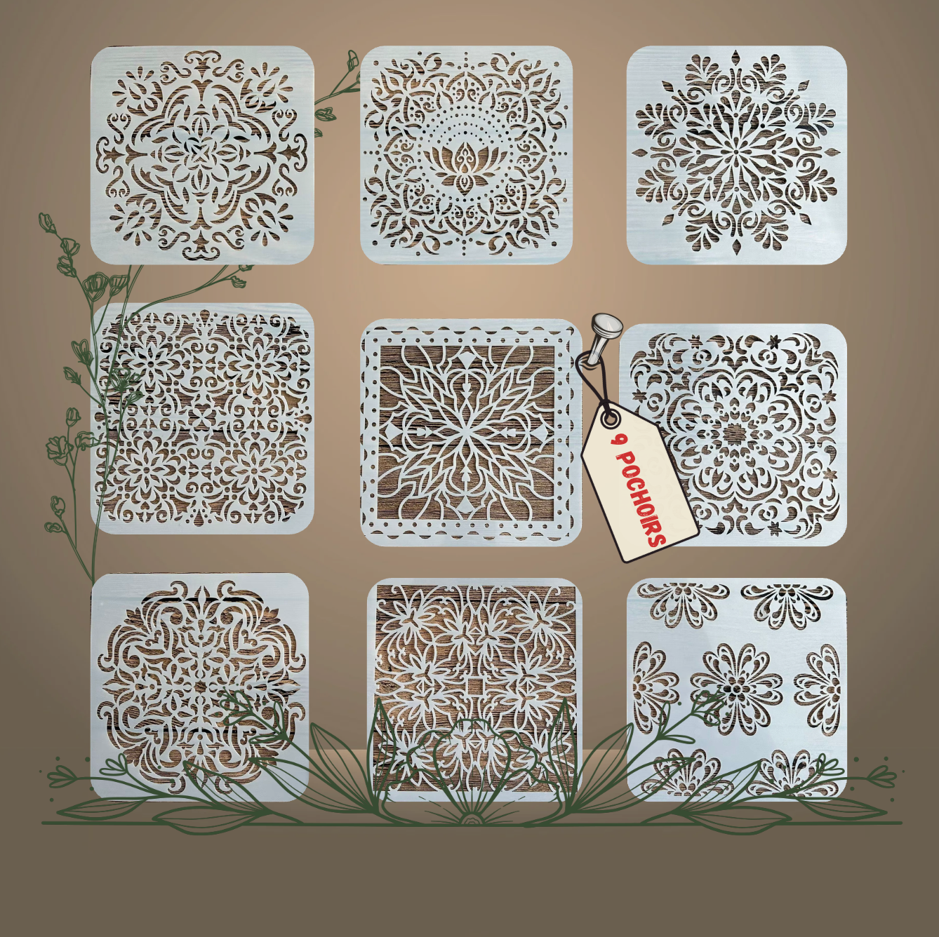 9pcs Pochoirs Carreaux 15x15cm